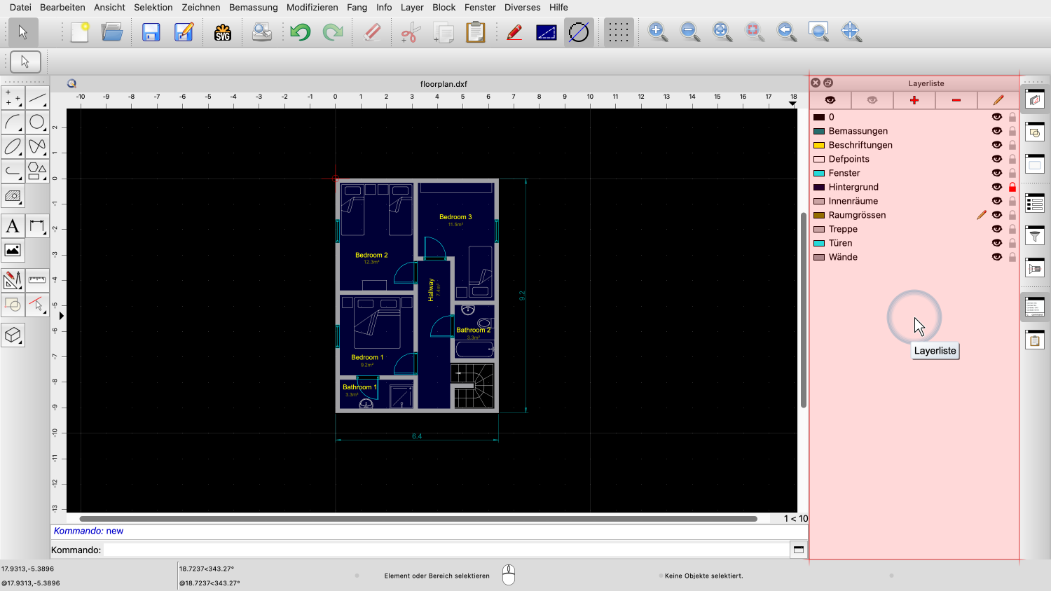 Die Layer dieser Zeichnung sind in der Layerliste rechts zu sehen.