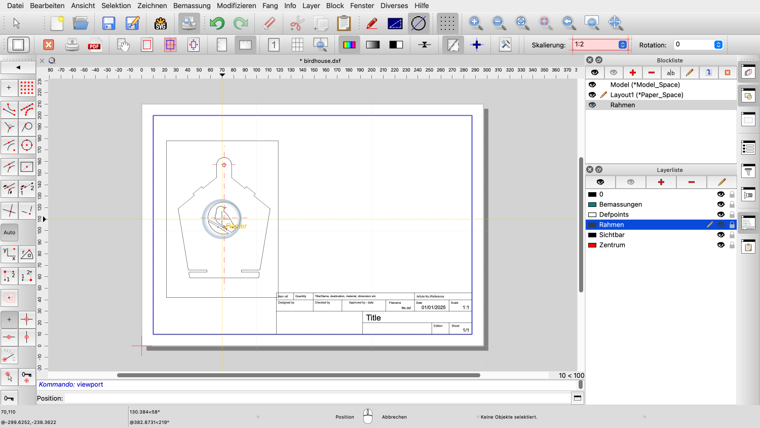 Ausserdem wollen wir einen Rahmen und einen Titelblock mit Informationen über die Zeichnung hinzufügen.