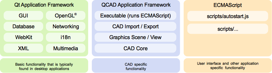 The QCAD Application Framework consists of several programming libraries as well as resources such as fonts or hatch patterns and an executable which is capable of running ECMAScript code.