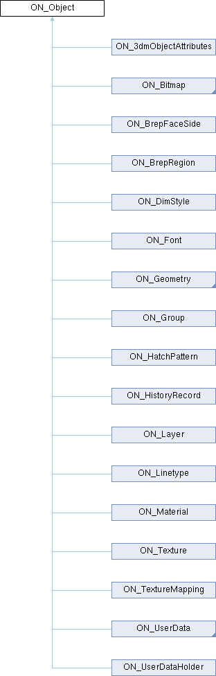 Reimplemented in ON_3dmObjectAttributes, ON_AnnotationTextDot, ON_AnnotationArrow, ON_Annotation, ON_Annotation2, ON_LinearDimension2, ON_RadialDimension2, ON_TextEntity2, ON_Leader2, ON__OBSOLETE__CircleCurve, ON_ArcCurve, ON_WindowsBitmap, ON_WindowsBitmapEx, ON_EmbeddedBitmap, ON_BrepVertex, ON_BrepEdge, ON_BrepTrim, ON_BrepLoop, ON_BrepFace, ON_Brep, ON_CurveOnSurface, ON_CurveProxy, ON_DimStyle, ON_Font, ON_Group, ON_HatchPattern, ON_Hatch, ON_Layer, ON_Light, ON_LineCurve, ON_Linetype, ON_Material, ON_Mesh, ON_MeshNgonUserData, ON_NurbsSurface, ON_PlaneSurface, ON_ClippingPlaneSurface, ON_PointCloud, ON_Point, ON_PointGrid, ON_PolyCurve, ON_PolyEdgeSegment, ON_RevSurface, ON_SumSurface, ON_SurfaceProxy, ON_UnknownUserData, ON_Viewport, ON_TextDot, ON_NurbsCage, ON_MorphControl, ON_AngularDimension2Extra, ON_TextExtra, ON_DimensionExtra, ON_Extrusion, ON_BrepFaceSide, ON_BrepRegion, ON_BrepRegionTopologyUserData, ON_DetailView, ON_DimStyleExtra, ON_HatchExtra, ON_InstanceDefinition, ON_InstanceRef, ON__LayerExtensions, ON_NurbsCurve, ON_HistoryRecord, ON_PolylineCurve, ON_Texture, ON_TextureMapping, ON_UserStringList, ON_AngularDimension, ON_TextEntity, ON_AngularDimension2, and ON_OrdinateDimension2.