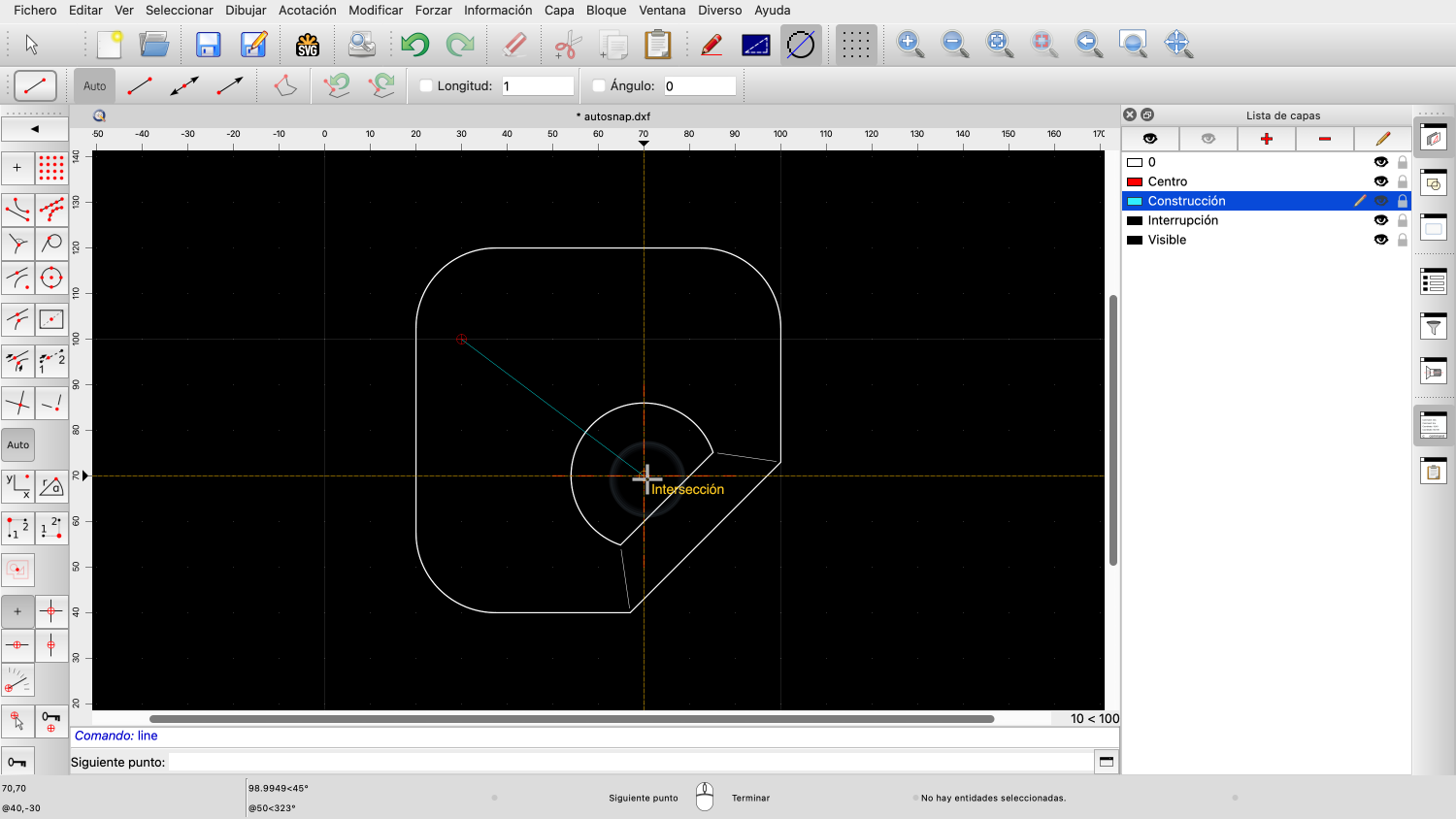 Por ejemplo, si acercamos el ratón a la intersección de las dos líneas rojas centrales, QCAD forzará automáticamente el punto de intersección de las dos líneas.
