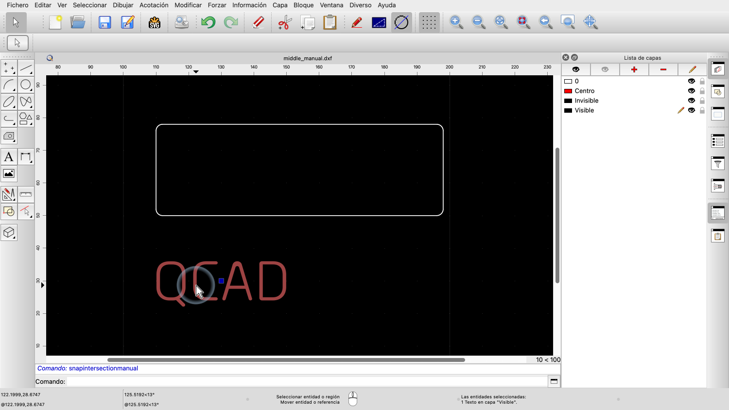 Tenga en cuenta que no tenemos que situar el cursor del ratón exactamente en el punto de intersección, sólo lo suficientemente cerca para que QCAD sepa que queremos utilizar ese punto.