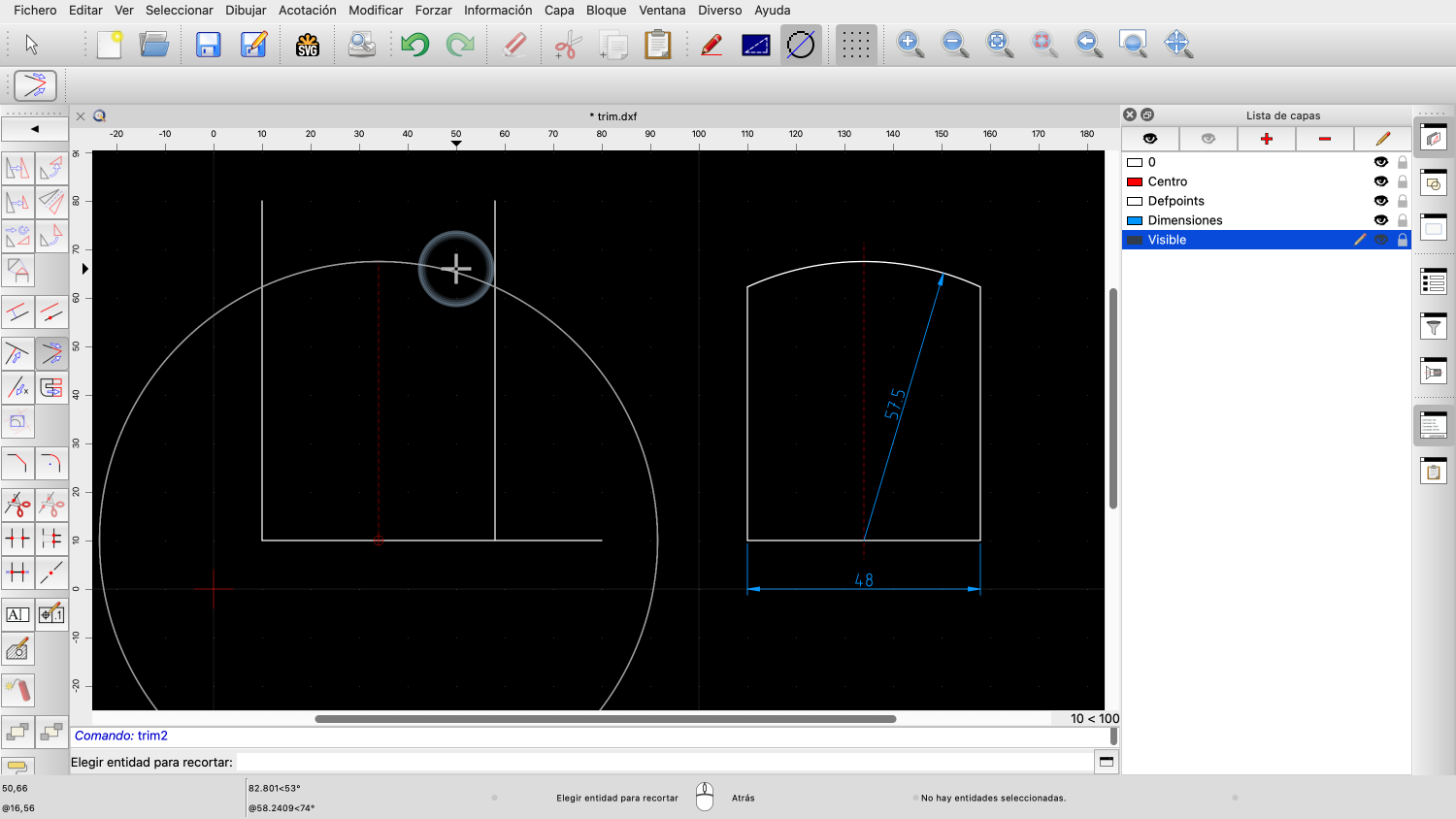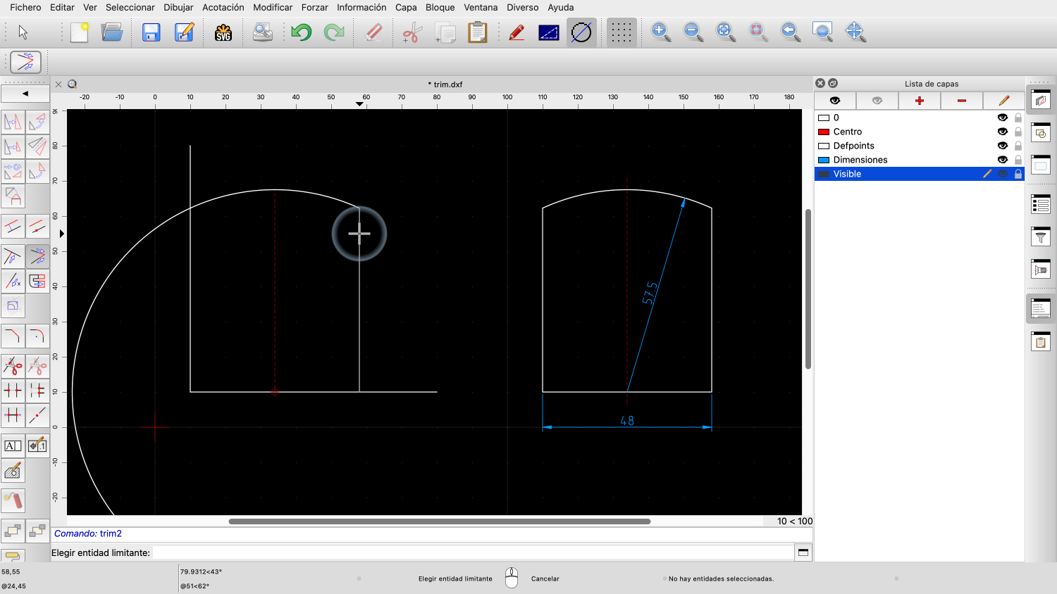 Para ello, podemos utilizar las herramientas de recorte de QCAD.