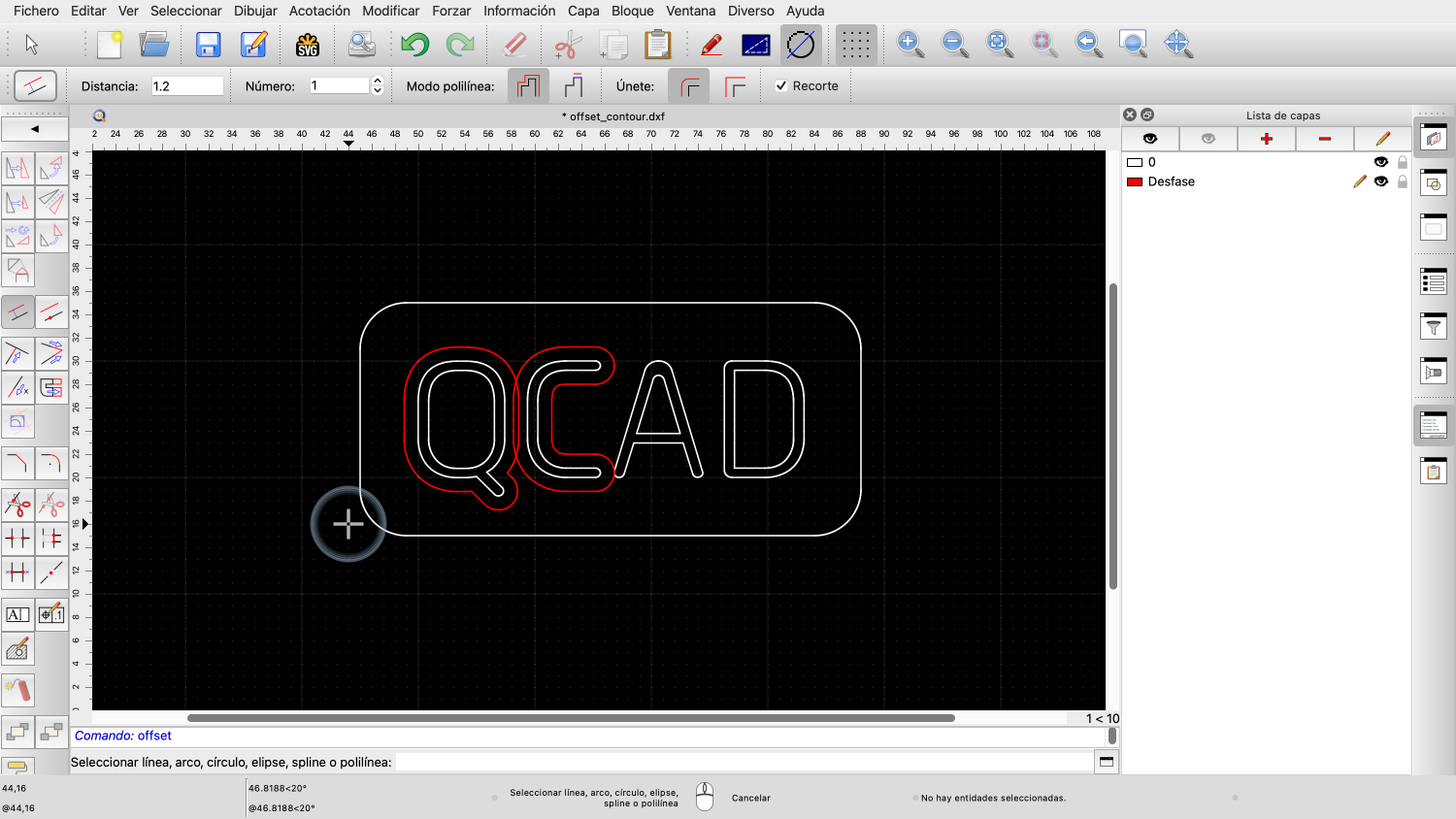 Si hacemos clic en una polilínea o en una cadena de entidades conectadas, QCAD desfasa automáticamente todo el contorno.