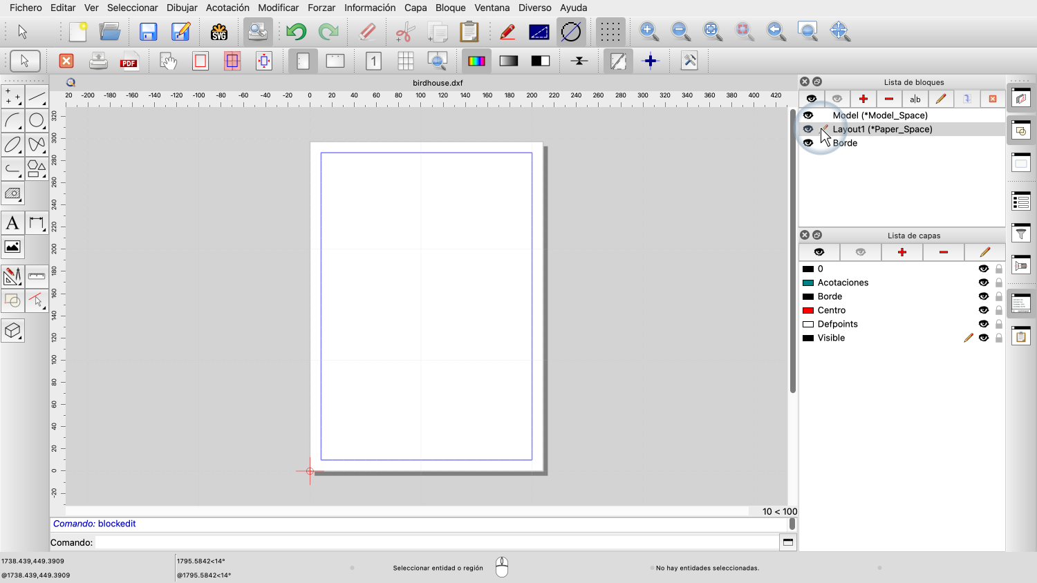 Dependiendo de nuestra versión de QCAD, también podemos ver los bloques de presentación del dibujo actual como pestañas debajo del área de dibujo para mayor comodidad.
