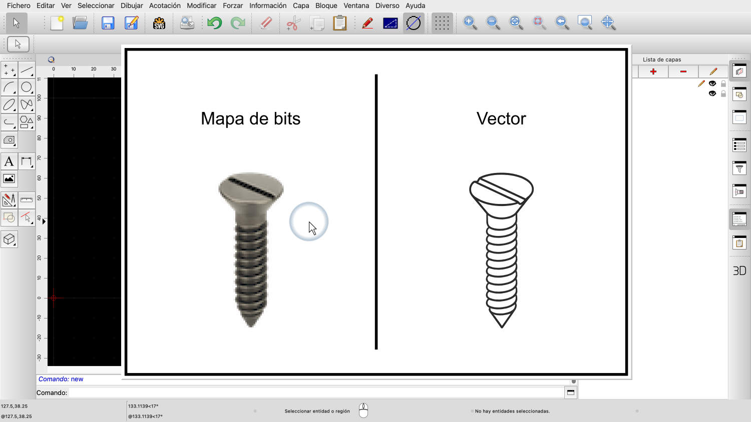 En este ejemplo, podemos ver un mapa de bits de un tornillo a la izquierda y un dibujo vectorial del mismo tornillo a la derecha.