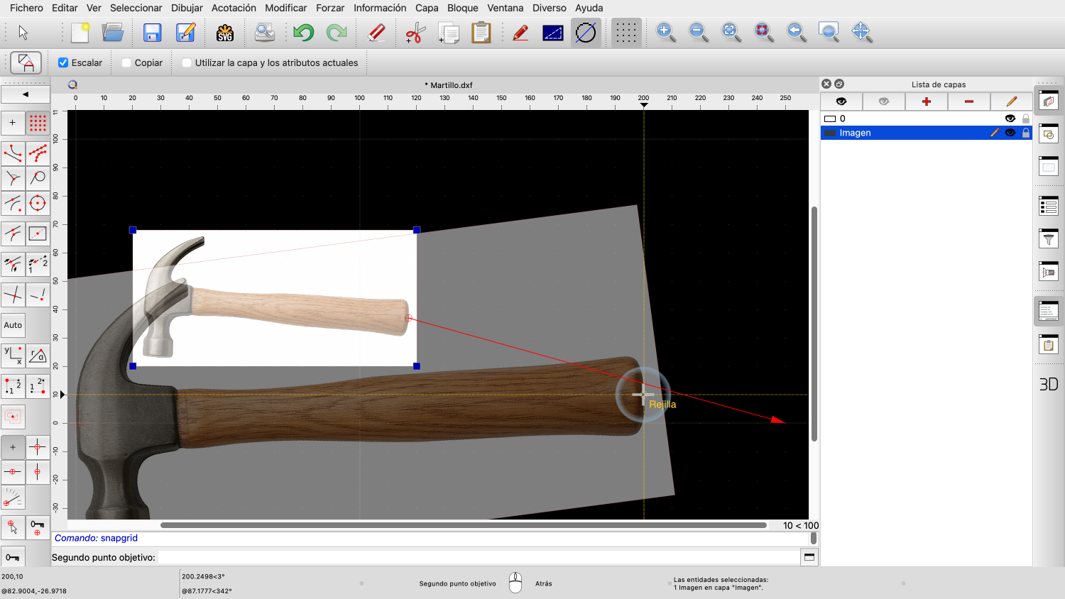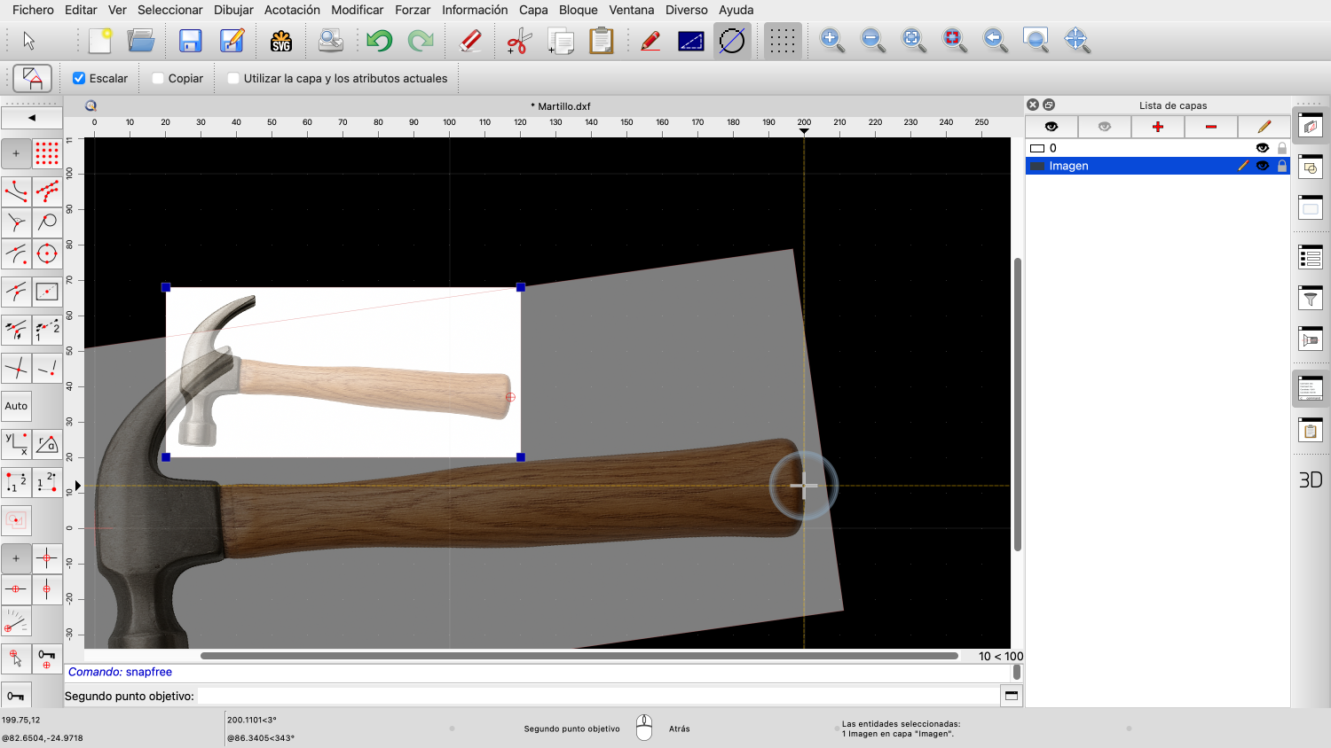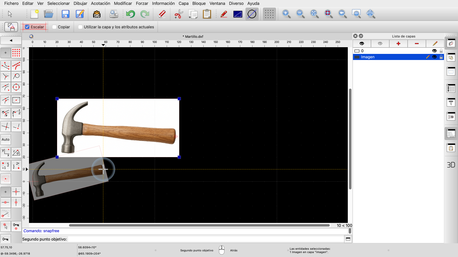 En los pasos siguientes, escalaremos y rotaremos la imagen para que el mango del martillo quede horizontal y el martillo tenga el tamaño deseado.