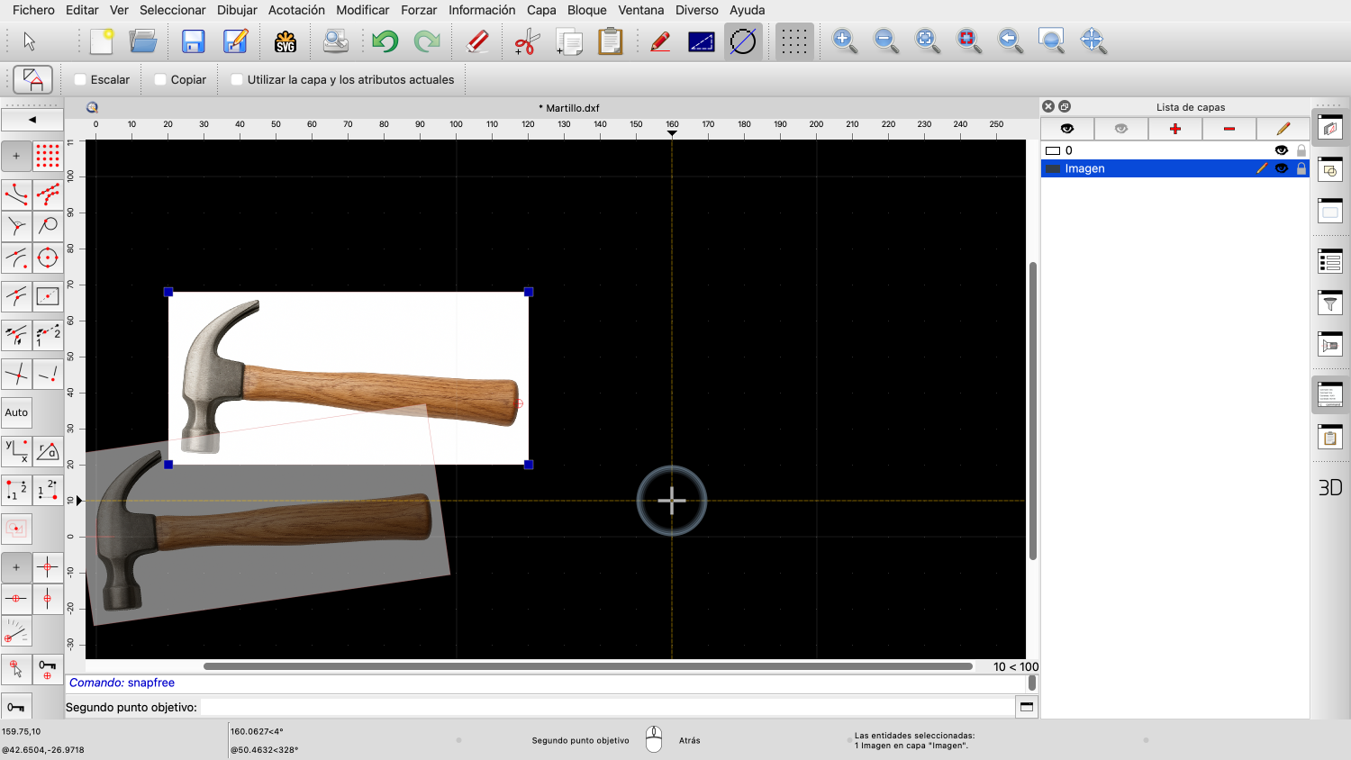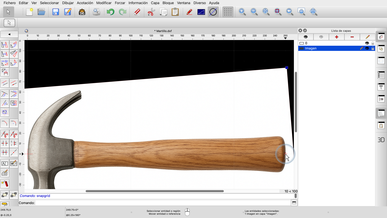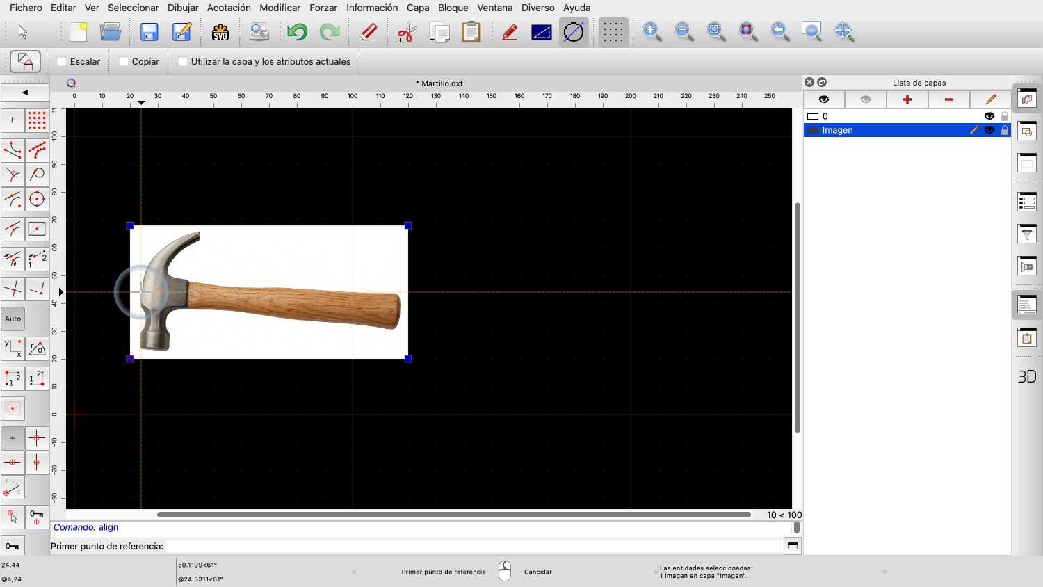 En los pasos siguientes, escalaremos y rotaremos la imagen para que el mango del martillo quede horizontal y el martillo tenga el tamaño deseado.