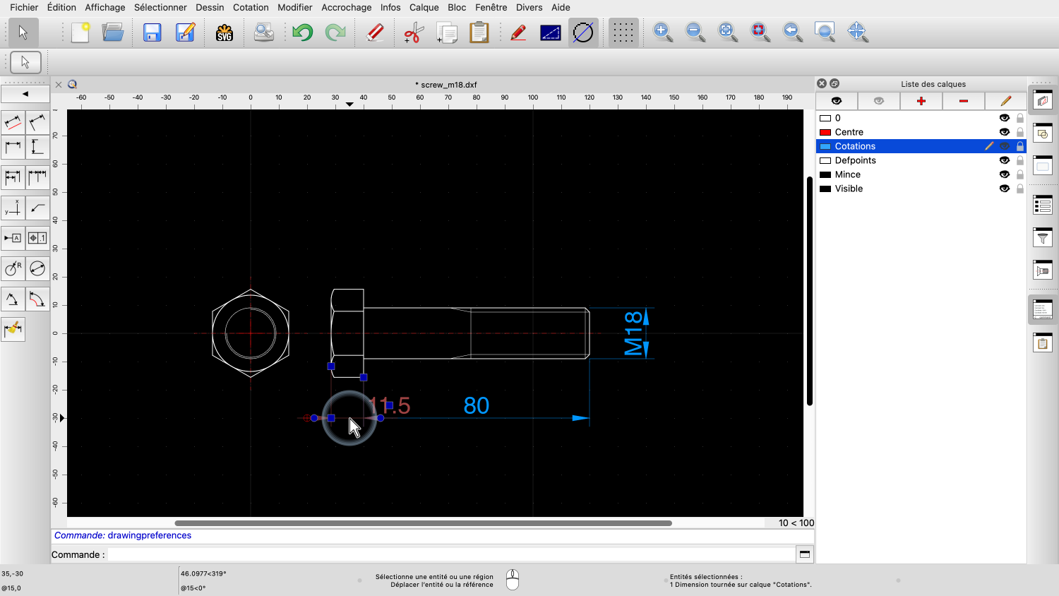 Dans ce dessin, nous voulons déplacer l'étiquette de texte de la cotation de la tête de vis.