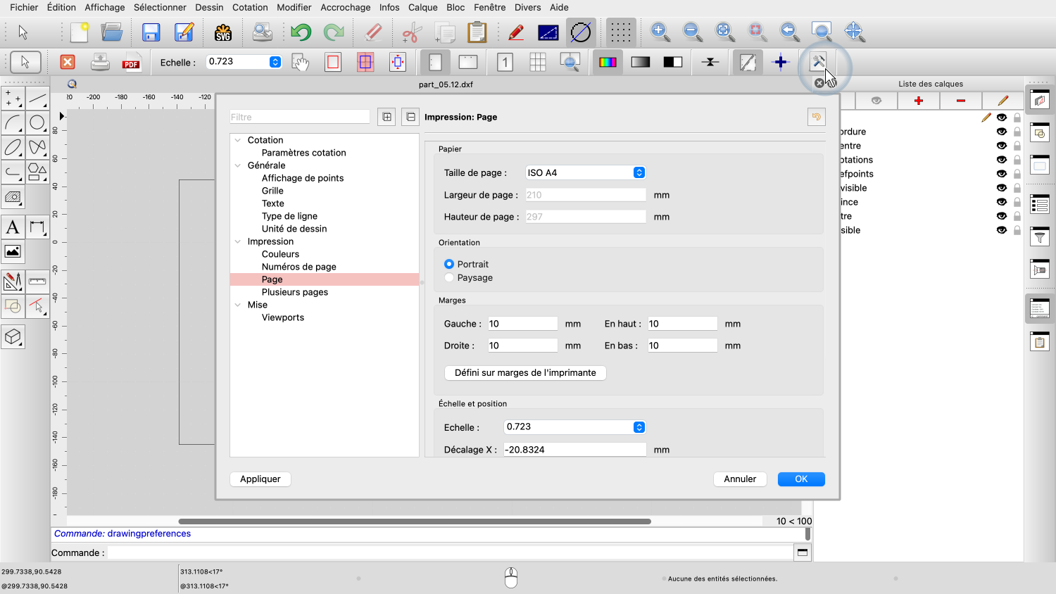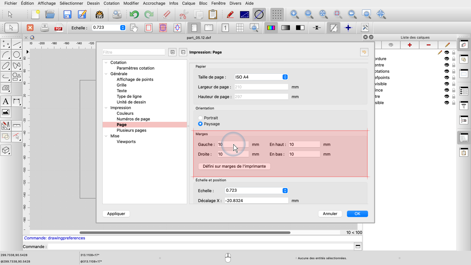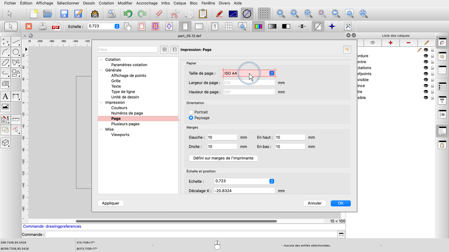 Avant d'essayer d'ajuster l'échelle et la position du dessin, nous nous assurons que la page est configurée comme souhaité.