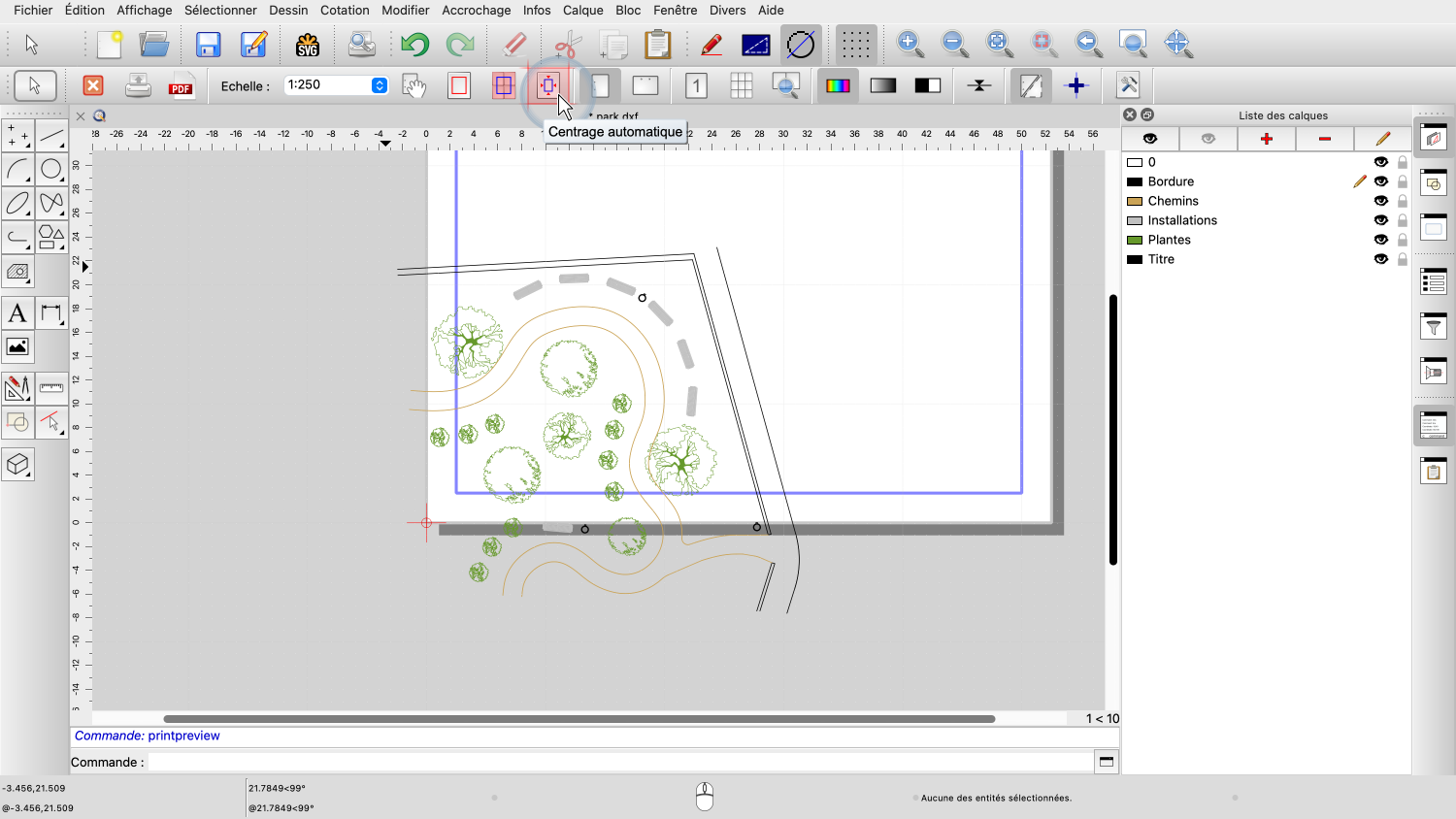 Pour ajuster la position du dessin, nous utilisons l'outil pour centrer automatiquement le dessin sur la page.