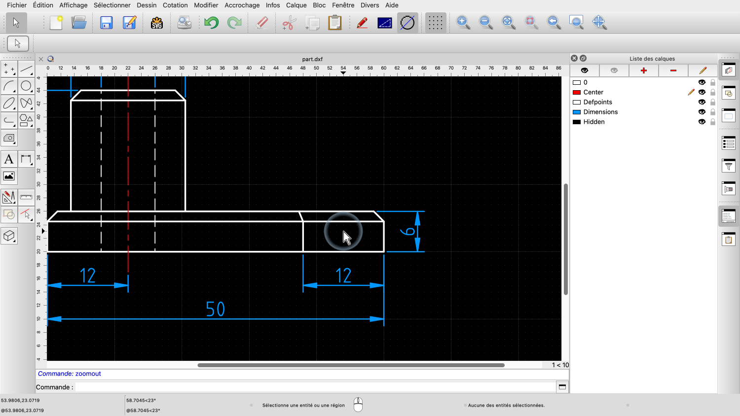 Dès que nous relâchons le bouton de la souris, QCAD zoome sur la zone choisie.