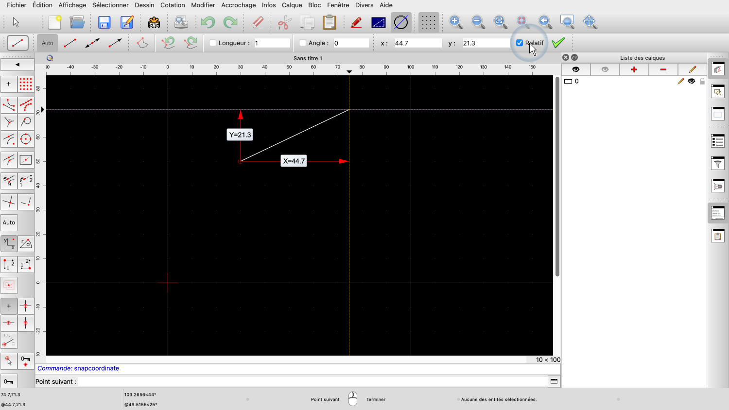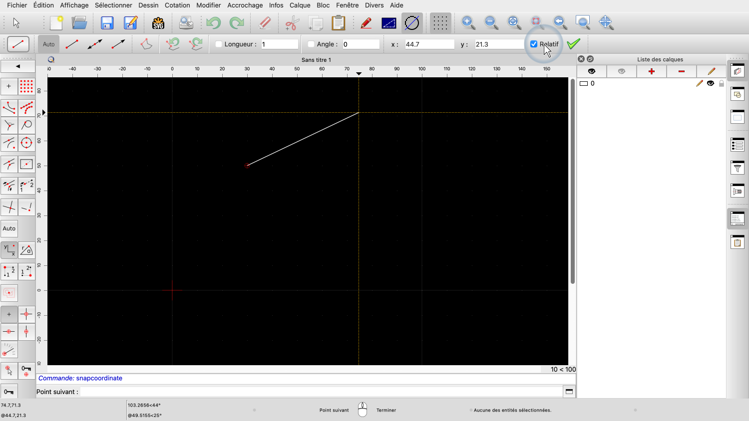 Notez que le point zéro relatif a été automatiquement déplacé à l'extrémité de la ligne, de sorte que nous pouvons saisir directement une autre coordonnée relative pour le segment de ligne suivant.