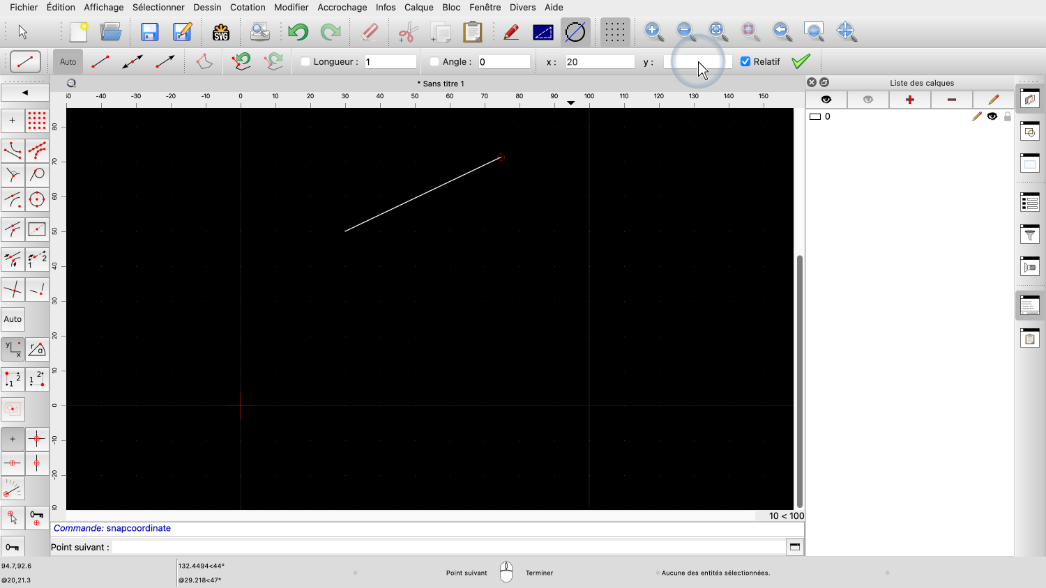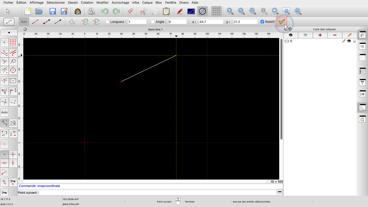 En entrant des coordonnées relatives, nous pouvons indiquer à QCAD les mesures souhaitées de notre ligne dans les directions [X] et [Y].