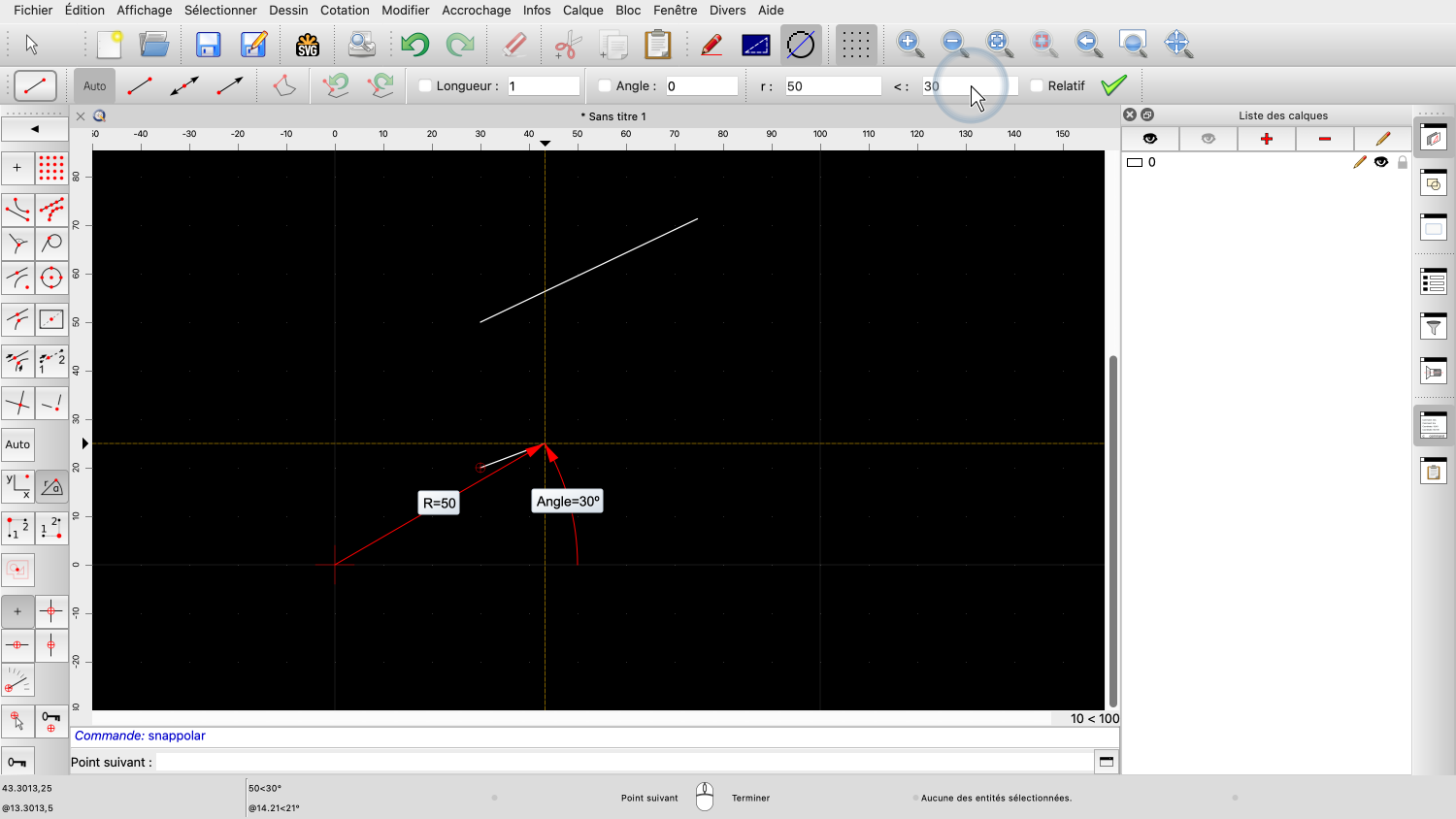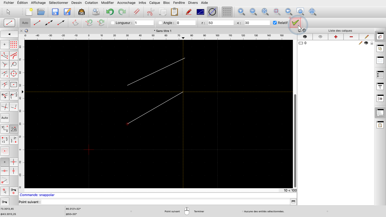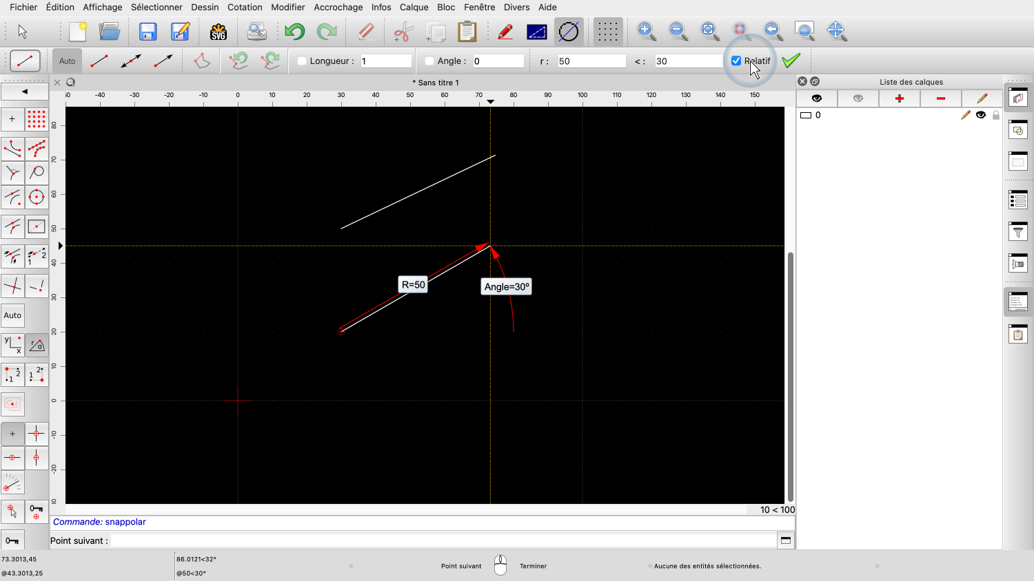 Si nous activons également les coordonnées relatives, nous pouvons tracer une ligne de 50 unités de long à un angle de 30 degrés.