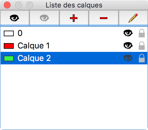 La liste des calques montre tous les calques du dessin. Il indique également quelle calque est actuellement active. C'est le calque sur lequel vous dessinez. Les calques peuvent également être ajoutés, supprimés, activés / désactivés, etc.