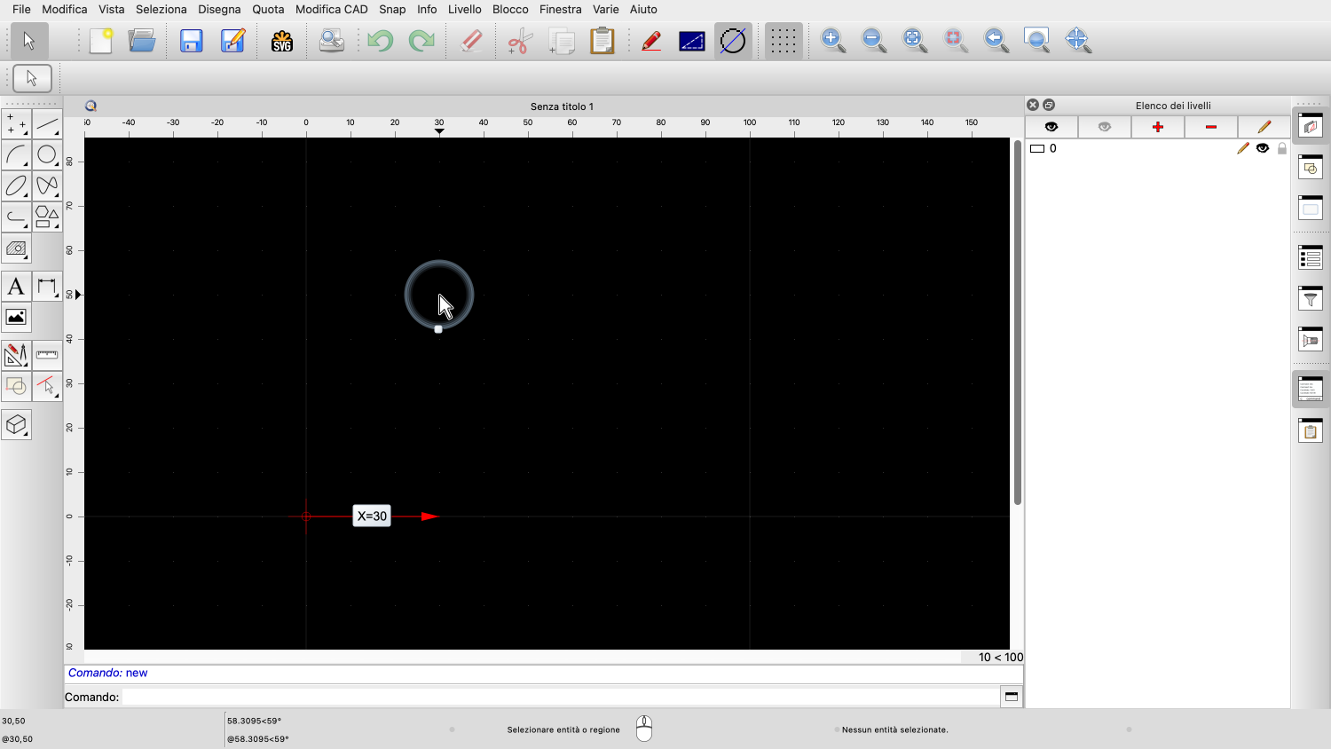 La distanza dall'origine al puntatore del mouse in direzione dell'asse [X] è di 30 unità di disegno.
