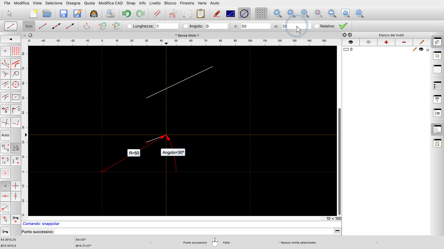 Questo ci indica una posizione a 50 unità di distanza dall'origine del disegno, con un angolo di 30 gradi.