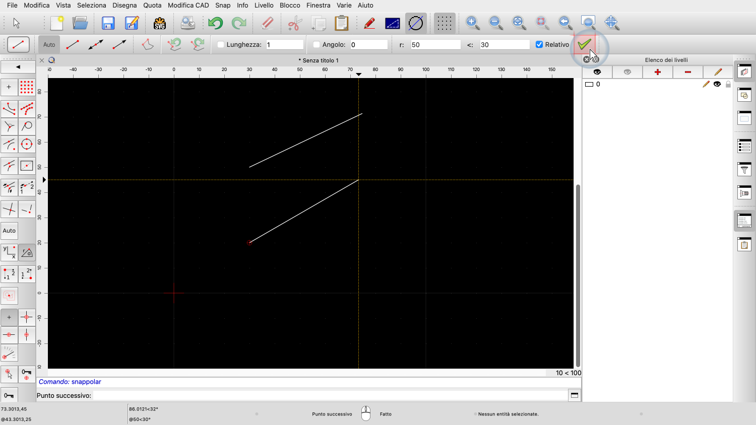 Se attiviamo anche le coordinate relative, possiamo disegnare una linea lunga 50 unità con un angolo di 30 gradi.