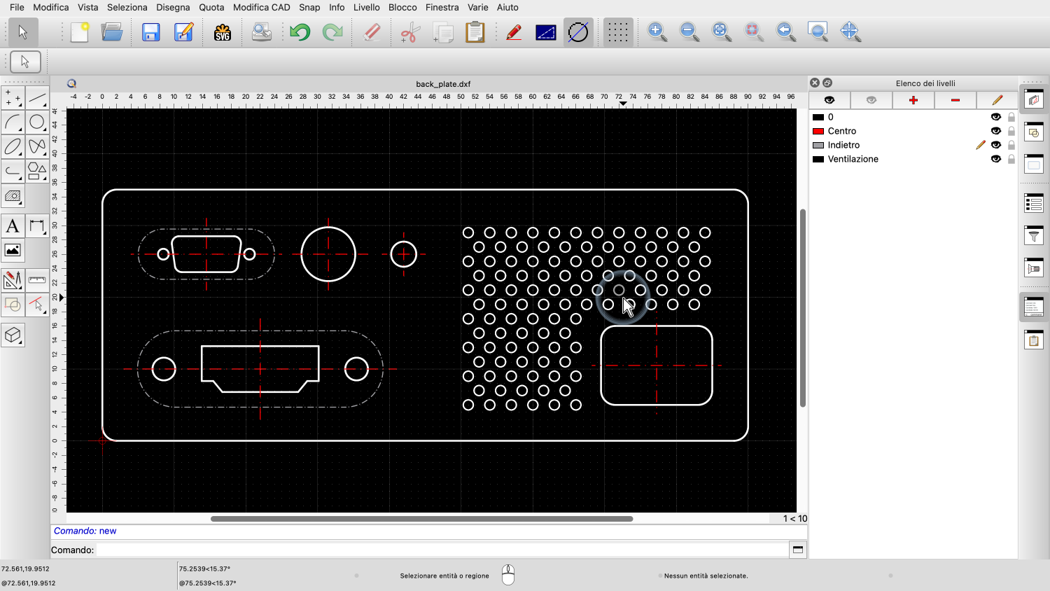 Per dimostrare gli strumenti di selezione di base di QCAD, diamo un'occhiata a questo esempio di disegno di una piastra posteriore per un apparecchio elettronico.