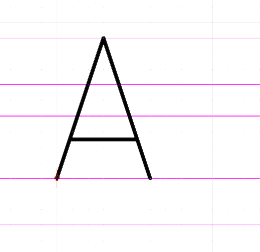 Por convención del formato CXF, una "A" mayúscula debe construirse con una altura de 9 unidades de dibujo. Cuando se utiliza para una entidad de texto, QCAD la escala según la altura del texto elegida por el usuario. Los glifos deben tener su punto de referencia 0,0 en la esquina inferior izquierda de la línea de base. En el formato CXF, los glifos pueden contener líneas, arcos y polilíneas. Pueden utilizarse splines, pero se convierten en polilíneas durante la exportación.