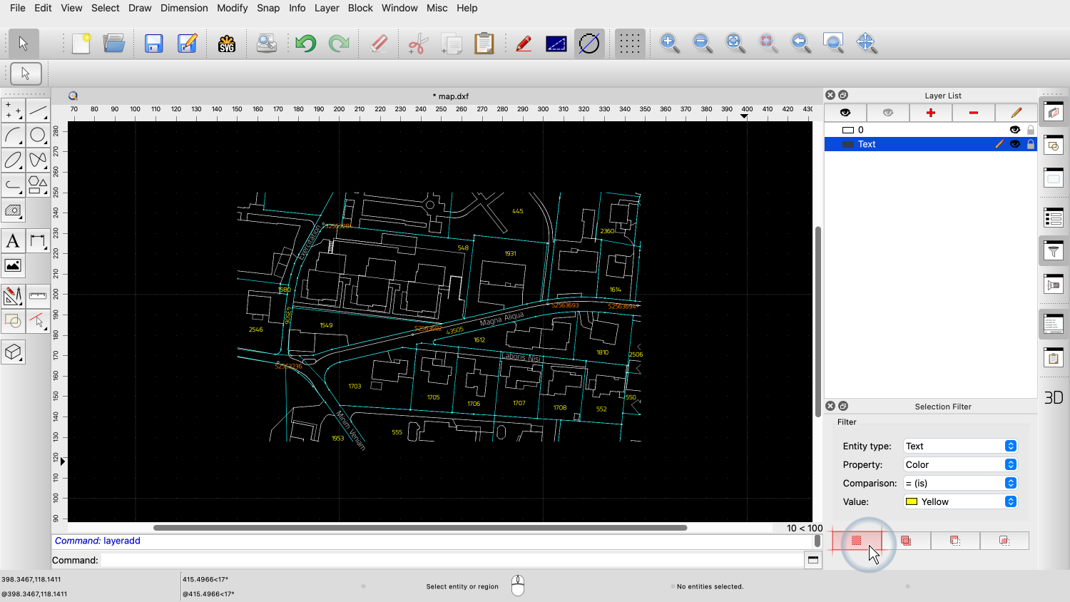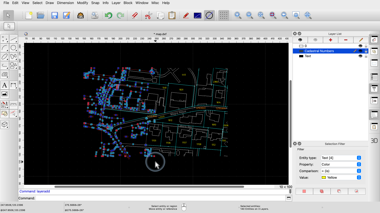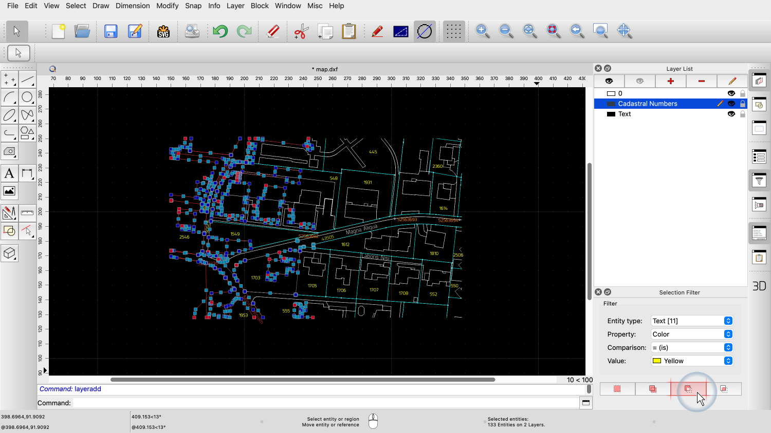 move them to a dedicated layer called "Cadastral Numbers". For this, we need to filter the text entities