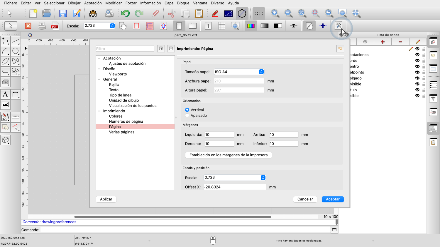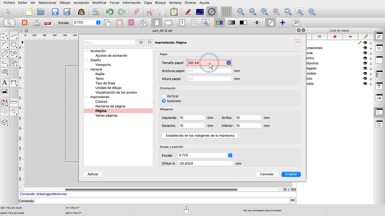 Antes de intentar ajustar la escala y la posición del dibujo, nos aseguramos de que la página está configurada como deseamos.