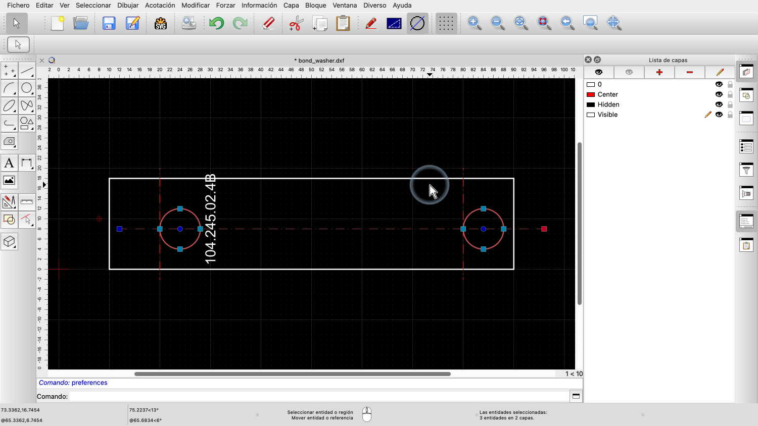 La línea central y los dos círculos están ahora en el portapapeles de QCAD.